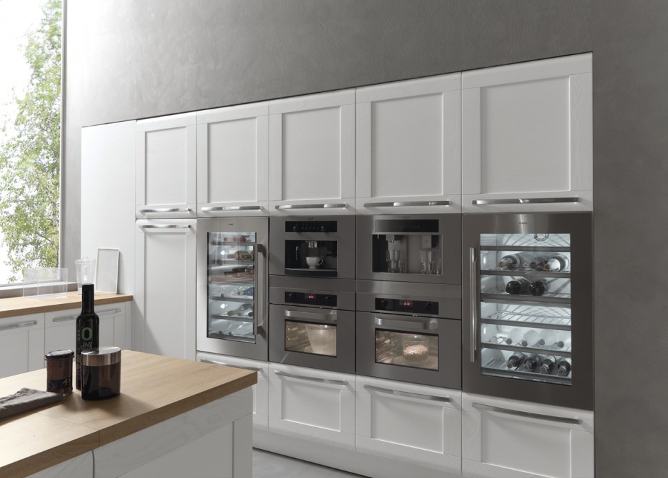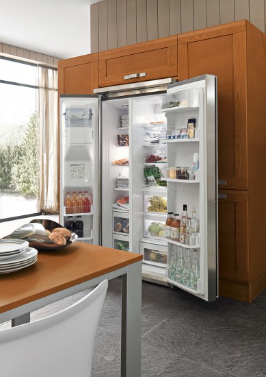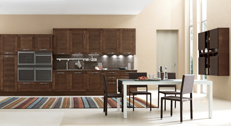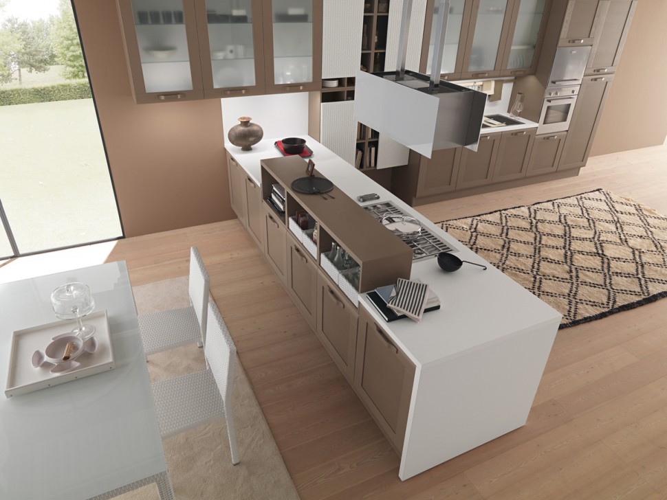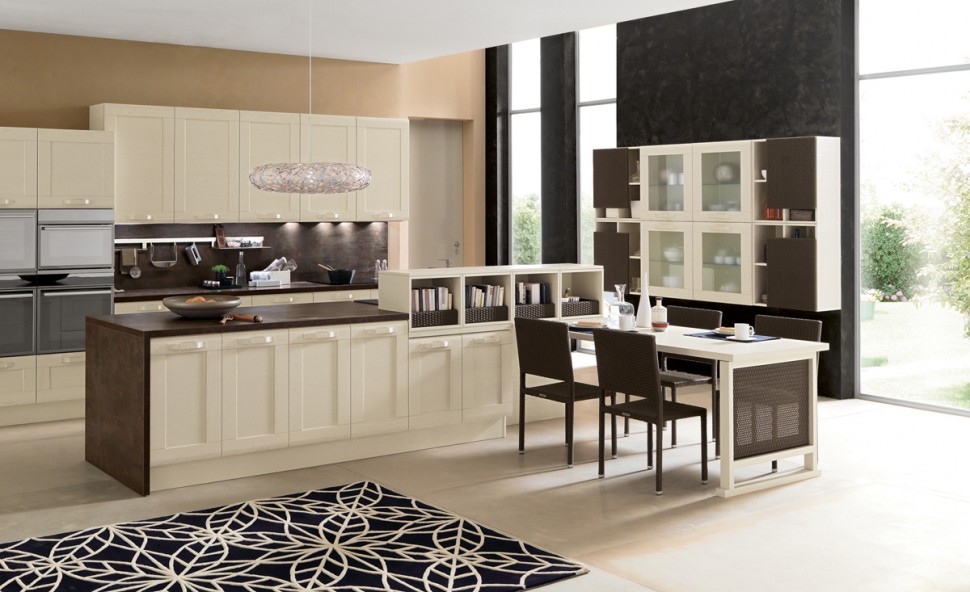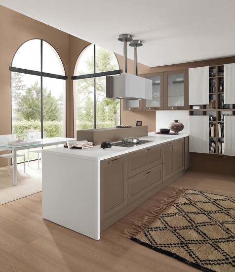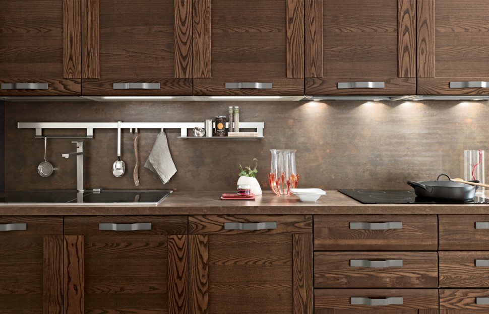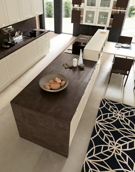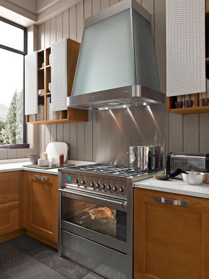 Οι χειρολαβές της Kelly μπορούν να παραχθούν και σε ξύλο κερασιάς ή φλαμουριάς ενισχύοντας το παραδοσιακό της παρελθόν χωρίς όμως να χάνει το σύγχρονο χαρακτήρα της. Η στροφή στα φυσικά υλικά ενισχύεται από την χρήση του υφασμάτινου ρατάν σε πολλά στοιχεία της κουζίνας.