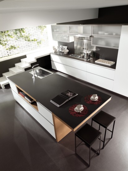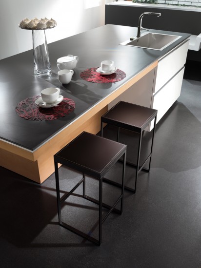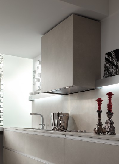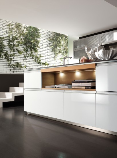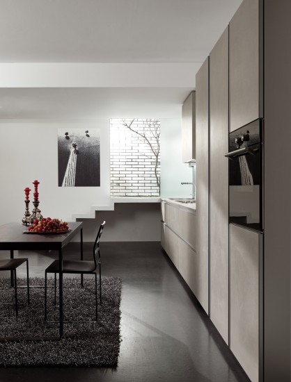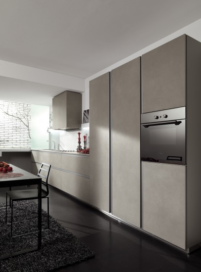 Η απάντηση στα παραπάνω νέα δεδομένα είναι ο επανασχεδιασμός των όγκων όλων των ερμαρίων από την αρχή. Έτσι το μπάζο γίνεται μόλις 6 εκατοστά ύψος. Αυτό έχει σαν αποτέλεσμα να δημιουργούνται ψηλότερα ερμάρια κρεμαστά και βάσεως, περισσότερος χώρος που μαζί με το πάχος των πορτών (25 mm) και την ενσωματωμένη χειρολαβή η κουζίνα αποκτά νέα αισθητική.